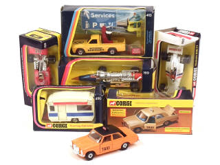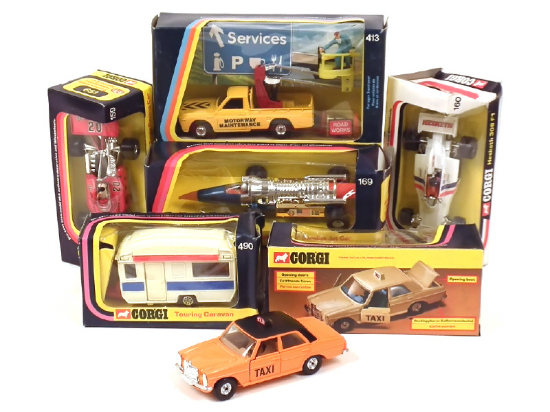 comprend : PATRICK EAGLE RACING CAR, HESKETH 308 F1 RACING CAR (boîte déformée), ARNOLD SUNDQUIST'S SWEDISH JET CAR (état 'A', boîte déformée ), MERCEDES BENZ 240D 'TAXI', MAZDA MOTORWAY MAINTENANCE TRUCK (avec personnage & accessoires) & caravane (état 'A', boîte déformée)