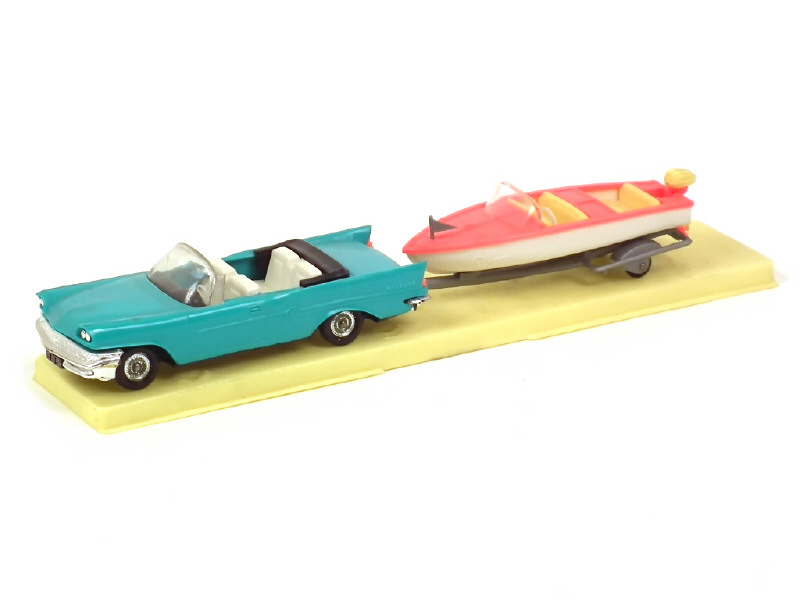NOREV (FRANCE) 92 CHRYSLER NEW YORKER avec hors-bord ROCCA sur remorque vert turquoise, blanc & orange fluo