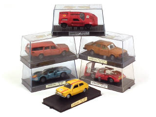 comprend : FIAT 127 SPORT (défaut de fermeture du capot moteur), VOLVO 244 DL, MERCEDES C111 (état 'B', manque vis de fixation), ALFA ROMEO PINIFARINA, MATRA SPORT & VOLVO 145 - couvercles de boîtes salis avec traces de ruban adhésif