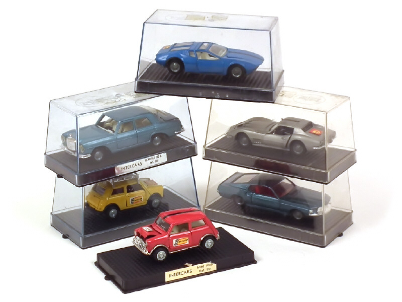 comprend : DE TOMASO MANGUSTA, CHEVROLET CORVETTE, FORD MUSTANG, MINI (1000, rallye) & MERCEDES 280S (vitrage cassé & désolidarisé du toit, défaut de fermeture du coffre) - couvercles de boîtes salis avec traces de ruban adhésif