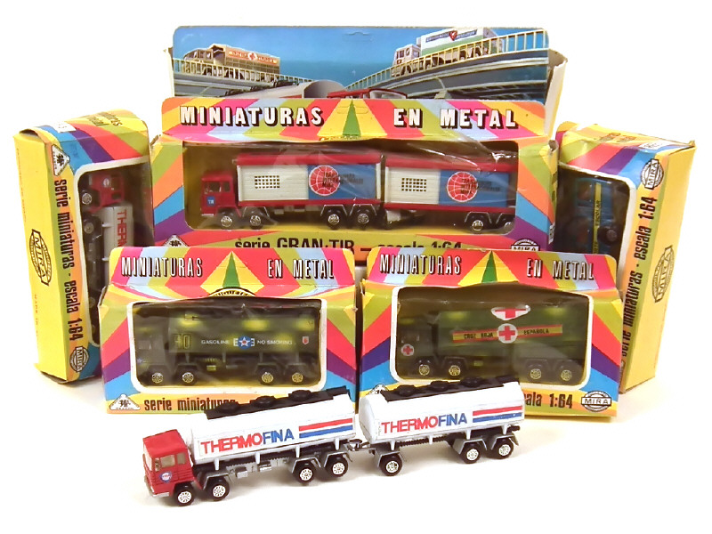 échelle 1/64ème - comprend : transport de ciment (2 exemplaires différents dont un avec blister manquant), transport de produits chimiques, semi-citerne avec remorque 'THERMOFINA' (série 'GRAN-TIR', blister déchiré) & MERCEDES autocar militaire