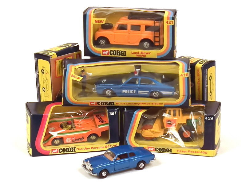 comprend : ROLLS ROYCE SILVER SHADOW, MERCEDES 350 SL, LAND ROVER 109 WB, PORSCHE 917-10 CAN-AM, BUICK CENTURY 'POLICE' & rouleau compresseur RAYGO RASCAL 400 - 2 boîtes en état 'c'