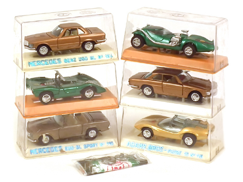 comprend : TWIN MILLE, MERCEDES 350 SL, 230 SL SPORT (en état 'B,c'), ISO RIVOLTA coupé GT, FERRARI CAN-AM (jantes très légèrement fondues) & ADAMS BROS - (avec sachet d'accessoires)