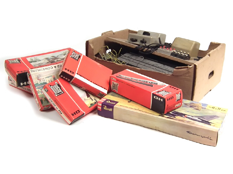 états de 'C' à 'D' - comprend notamment : transformateurs, accessoires de voies (2 de la marque JEP) & maquettes - nombreux manques & parties cassées - on y joint quelques boîtes vides de la marque - ensemble poussieureux