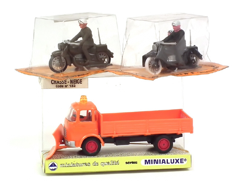 une trace de colle d'origine sur le pare-brise & le haut de cabine - sur socle de présentation - on y joint 2 motos avec side-car (militaire & police) de la marque sous blisters plus ou moins déchirés jamais ouverts