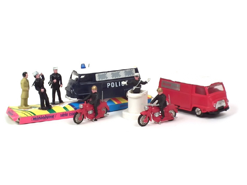 échelle 1/32ème - série 'COMPACT' - contient : RENAULT ESTAFETTE 'POLICE' (antenne incomplète), 2 policiers & un inspecteur - sur socle de présentation (en état 'c') & déformé - manque blister de boîte - on y joint une RENAULT ESTAFETTE 'BOUCHERIE' en état 'C' avec parties fendues & manquantes, 2 motocyclistes de pompiers (manque un guidon & une fixation) & un agent de la circulation avec ilot