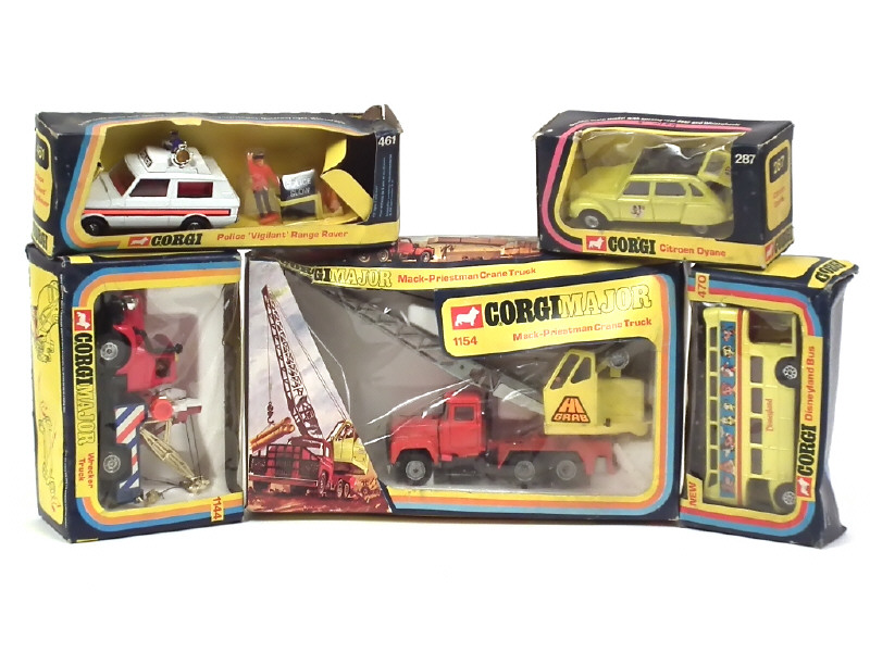 comprend : ROUTEMASTER 'DISNEYLAND' autobus londonien (barre de maintien oxydée), CITROEN DYANE, RANGE ROVER 'POLICE' (avec accessoires jamais ouverts, manque blister de boîte), BERLIET dépanneuse & MAC avec grue PRIESTMAN (traces d'oxydation sur la flèche de grue) - boîtes déformées