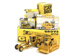 comprend : CATERPILLAR 983 bulldozer sur chenilles (état 'A.b'), D4D (état 'D.b'), 12G profileur (état 'C.c'), BOMAG 90SL rouleau compresseur (état 'B.b') & GROVE RT75S grue sur roues (état 'A-.b', jantes plus ou moins fondues dont 2 avec traces de papier)