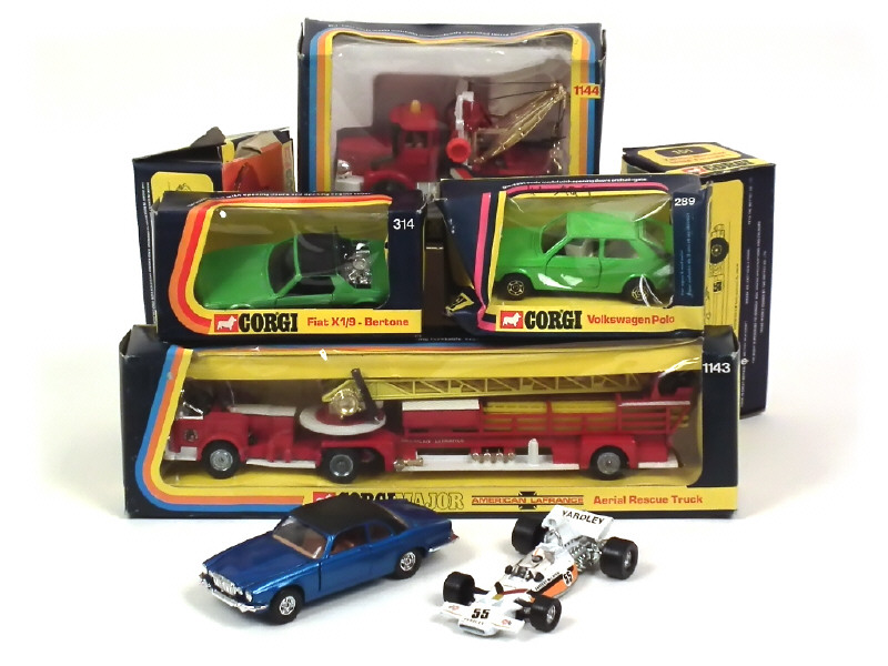 comprend : FIAT X1/9, VOLKSWAGEN POLO (boite en état 'c'), BERLIET dépanneuse, JAGUAR XJ12 C (boîte en état 'c'), Mc LAREN YARDLEY F1 (état 'B') & AMERICAN LAFRANCE grande échelle de pompiers - boîtes plus ou moins déformées avec petites déchirures sur les blisters