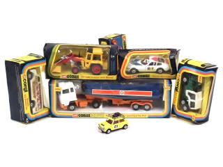 comprend : FORD semi-remorque citerne 'GULF', CHEVROLET 'VANATIC' (carrosserie encrassée), FERRARI 365 DAYTONA, MINI COOPER rallye de Monte-Carlo, MASSEY FERGUSSON 50B tracteur avec pelle (état 'A-') & JEEP CJ-5 - boîtes plus ou moins déformées
