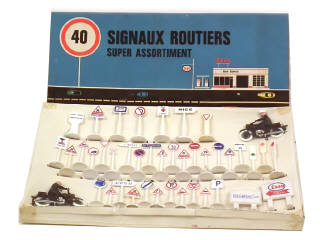dimensions : 38 x 22 cm - contient 2 motards de la police (dont un avec peinture du casque craquelée d'origine), 37 panneaux de signalisation différents & 3 feux tricolores - sur socle de présentation - sous film plastique jamais ouvert - coffret légèrement déformé