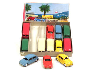 dimensions du coffret : 29 x 22 cm - contient : 4 VOLKSWAGEN COMBI (dont une avec une partie de toit décolorée), 2 FIAT MULTIPLA, 2 ALFA ROMEO GIULIETTA, 2 FIAT 600 & 2 VOLKSWAGEN COCCINELLE - moteurs à friction (fonctionnent) - avec séparations intérieures - quelques planchers légèrement ternis - petites déformations du coffret (taché par endroits)