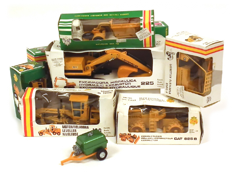 états de 'A' à 'C' - comprend : CATERPILLAR rouleau compacteur, 12 G niveleuse, 225 excavatrice sur chenilles (manque blister de boîte), chariot élévateur, camion remorque benne basculante, benne carrière & MASSEY-FERGUSON tracteur agricole avec pelle preneuse (jantes légèrement fondues) - les boîtes sont en état 'c' plus ou moins déformées