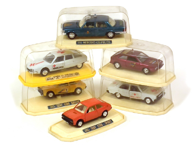 comprend : MERCEDES 450 'POLICIA' (manque fixations de socle de boîte), CITROEN CX 2400 PALLAS 'AMBULANCIA', VOLKSWAGEN SCIROCCO 'BOMBEROS', SEAT 1200 (2 exemplaires différents dont un avec fixations de boîte manquante) & 131 'AMBULANCIA'