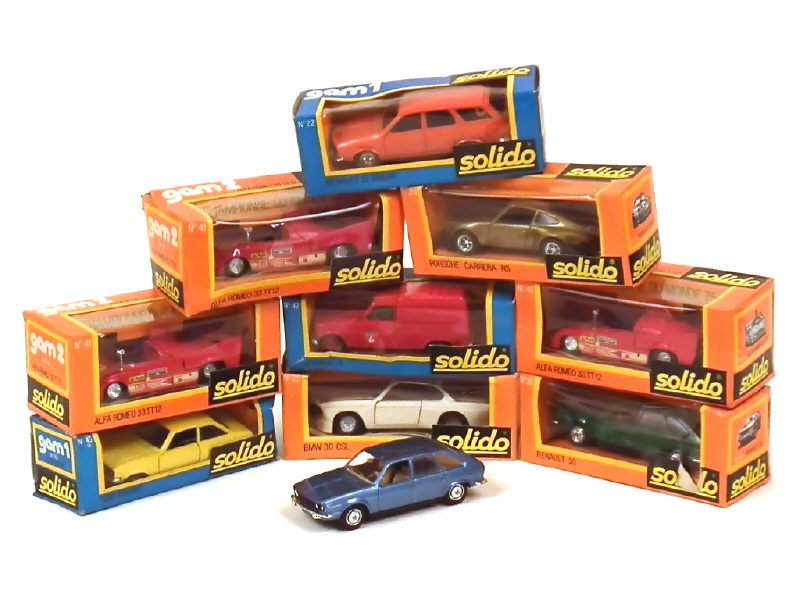 comprend : RENAULT 30 (2 exemplaires différents dont un avec blister de boîte manquant), 12 break, 4 fourgonnette de pompiers, FORD ESCORT, PORSCHE CARRERA, BMW 30 CSL & ALFA ROMEO 33 TT 12 (3 exemplaires) - boîtes plus ou moins déformées dont 3 en état 'c'