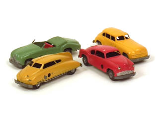 série 'JUNIOR' - non motorisés - comprend : conduite intérieure, CHEVROLET coupé, autocar de voyage (état 'D' avec petites traces de métal fatigue) & DELAHAYE cabriolet (pare-brise cassé) - quelques petites traces d'oxydation sur les planchers