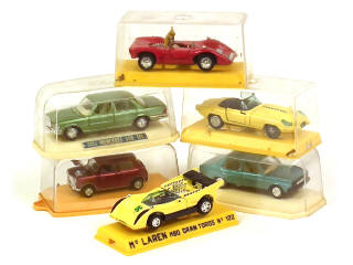 comprend : FERRARI CANAM, JAGUAR type E, SEAT 131, MERCEDES 450 SEL (manque sigle de calandre & vis de fixation de socle), MINI COOPER & Mc LAREN M80 - on y retrouve les marques : JOAL, PILEN & MIRA - 2 couvercles de boîtes légèrement fêlés