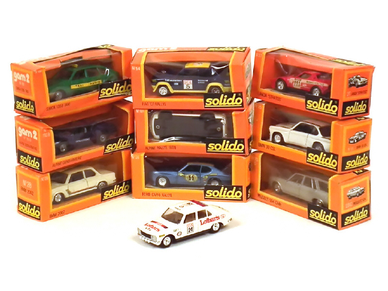 comprend : PEUGEOT 504 rallye, break, SIMCA 1308 'TAXI', FORD CAPRI rallye, BMW 2002, 30 CSL, ALPINE A310 'GENDARMERIE' (antenne cassée, avec petites rayures sur le toit), 1600 rallye, LANCIA STRATOS & FIAT 131 rallye - boîtes plus ou moins déformées dont 2 en état 'c'