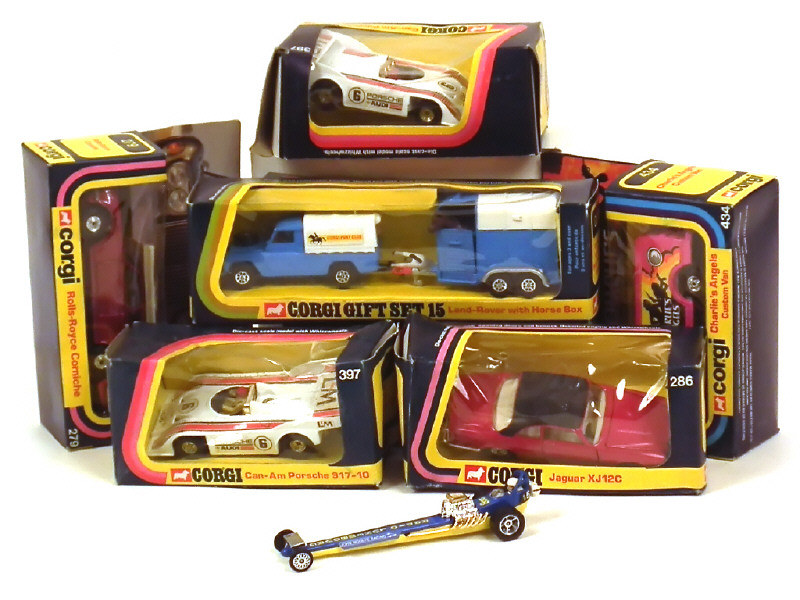 comprend : LAND ROVER 'CORGI PONEY CLUB', CHEVROLET van 'CHARLIES ANGEL', ROLLS ROYCE CORNICHE, JAGUAR XJ12C (boîte en état 'c'), JOHN WOOLFE dragster, PORSCHE 917-10 CAN AM (2 exemplaires identiques) - boîtes plus ou moins déformées