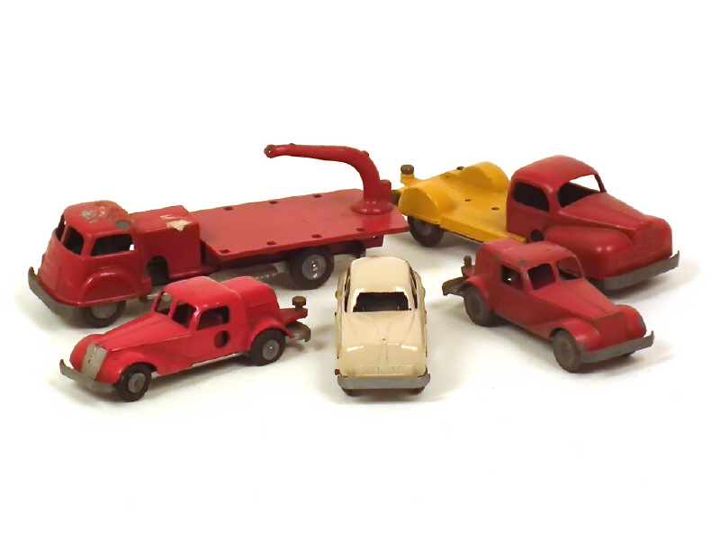 séries 'JUNIOR' & 'BABY' - comprend : camion plateau (état 'B'), plateau avec grue (état 'D' avec plancher cassé, traces de métal fatigue & quelques manques de zamac par endroits), tracteur routier (2 exemplaires état 'D' dont un avec un manque de zamac sur une aile) & STUDEBAKER 1947 (état 'C' avec légères traces de métal fatigue par endroits) - traces d'oxydation plus ou moins importantes sur les planchers & axes de roues - 4 pneus affaissés - certaines fixations manquantes