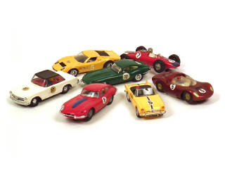 non testé - comprend notamment : MERCEDES 250SL (pneus fondus), JAGUAR type E (2 exemplaires différents, manque un feu sur chaque voiture), SUNBEAM (pare-brise cassé) & LAMBORGHINI - on y retrouve notamment la marque SCALEXTRIC - 4 voitures sans moteur