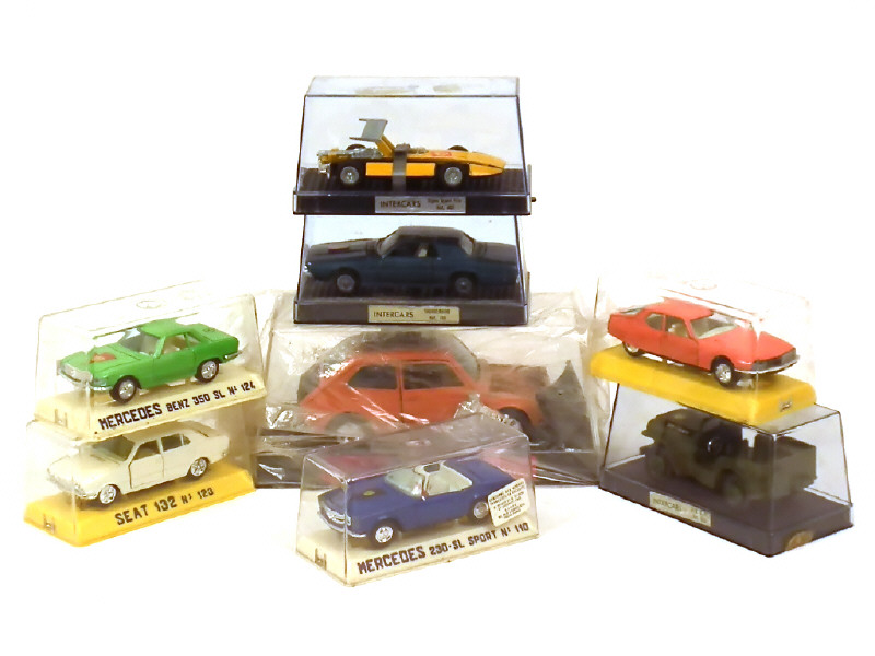 comprend : CITROEN SM, SEAT 132 (manque un feu), MERCEDES (230SL & 350SL), SIGMA GRAND PRIX, JEEP US ARMY, FIAT 127 SPORT rallye (grande échelle, fixation de capot moteur défectueuse) & FORD THUNDERBIRD - on y retrouve les marques : NACORAL & JOAL