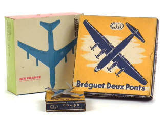 cockpit & réservoirs d'ailes bleus - boîte tachée par endroits - VARIANTE PEU COURANTE ! - on y joint une boîte vide de BREGET DEUX PONTS (avec cale) & une autre de BOEING 707 'AIR FRANCE' (avec cale) en états 'c'