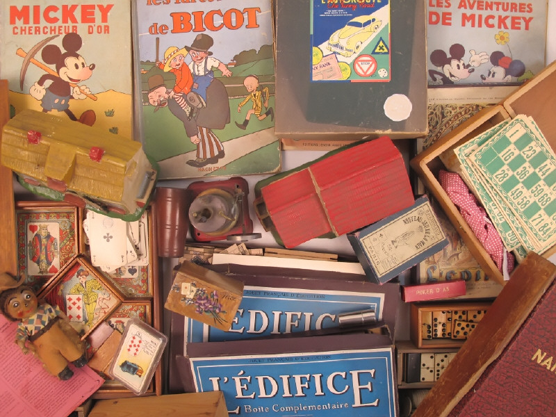 Etats divers - Principalement d'époque avant guerre (possibilité de manques) - comprend entre autre, 2 jeux de nain jaune, un Loto dans son coffret en bois, 2 jeux de dominos en bois, un coffret de jetons en os, 2 boîtes de pions d'échec en buis, un jeu de construction " L'édifice " avec deux boîtes complémentaires, un jeu de tarot " nouveau jeu de la main " BP GRIMAUD, divers jeux de cartes, gobelet et dés, un superbe jeu " l'Autoroute " , 2 fermes en composition avec figurines, une machine à vapeur JF (Germany), Hérisson celluloïd cow-boy, 4 albums de BD (Mickey chercheur d'or, les aventures de Mickey, Les farces de Bicot & le lièvre et la tortue), une Bécassine en tricot, manuels d'époque de jeux et nombreux objets divers. ENSEMBLE TRES INTERESSANT !