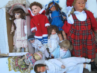 Bon état général (lot important à prendre en l'état) - On y retrouve : Une poupée porcelaine FRANKLIN, une poupée belge en composition, une marcheuse en composition, une poupée tête composition et corps articulée en bois, une poupée en composition CAPI (81 cm), poupée russe, 3 poupée année 30 à 50