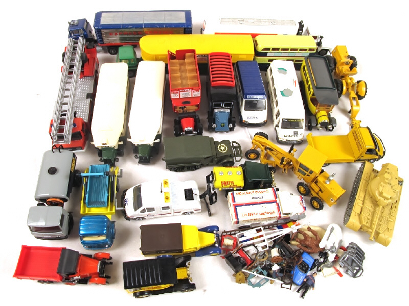Bon état général - Possibilités de manques et accidents (lot important à prendre en l'état) - On y retrouve les marques SOLIDO, CORGI, RIO, NOREV, JOAL, GAMA, divers URSS & OLD CARS - on y joint une enveloppe de pièces détachées et personnages