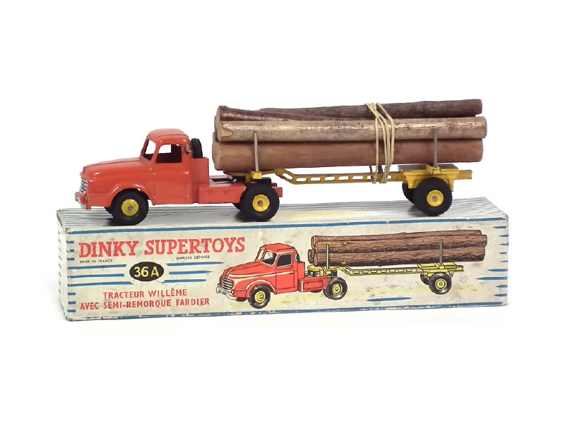 DINKY TOYS (FRANCE) 36A WILLEME Fardier (version avec jantes convexes & remorque ajourée) orange & jaune