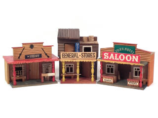réalisation en bois - comprend : SALOON (dimensions : 22x13x18 cm, une petite partie à recoller), GENERAL STORES (dimensions : 17x13x22 cm) & prison (dimensions : 21x13,5x18 cm)