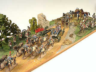 comprend une pièce d'artillerie tirée par 6 chevaux, 18 fantassins, un cavalier, une forge mobile avec soufflet, 3 maréchaux-ferrants au travail & une ambulance tractée par 4 chevaux