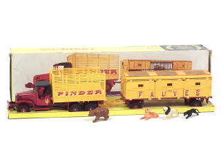 DINKY TOYS (FRANCE) 881 GMC 'PINDER' avec remorque-cage à fauves rouge & jaune