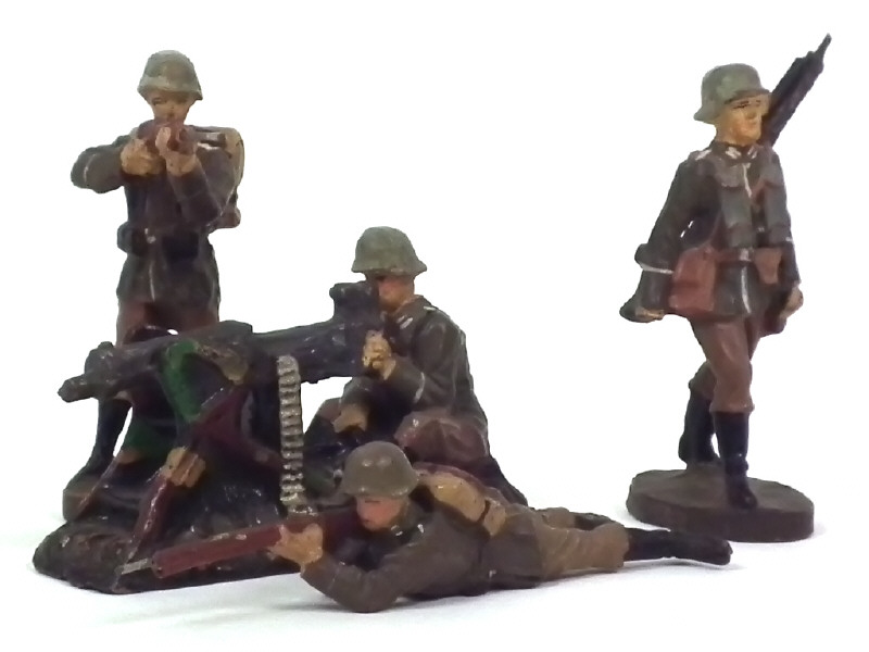réalisation en composition - hauteur : 7,5 cm - comprend : un soldat au défilé avec fusil mitrailleur (état 'C', manque une main), un allongé avec fusil, un tirant & un à la mitrailleuse - avec petits manques