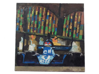 dimensions : 80 x 80 cm - représentant le pilote François CEVERT au volant d'une TYRELL ELF au Grand Prix de MONACO dans le virage de 'SAINTE DEVOTE' - signé : CADOUILLIET 1975