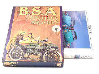 comprend : 2 puzzles de 1000 & 1500 pièces représentant une VOLKSWAGEN COCCINELLE & une moto BSA avec side-car (complets) & un ouvrage 'LE LIVRE DES ARMES & ARMURES' (avec suremballage déchiré & non présent sur la photo)