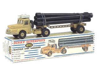 DINKY TOYS (FRANCE) 893 UNIC Saharien transport de pipe-lines (version avec jantes convexes & remorque ajourée) sable & blanc
