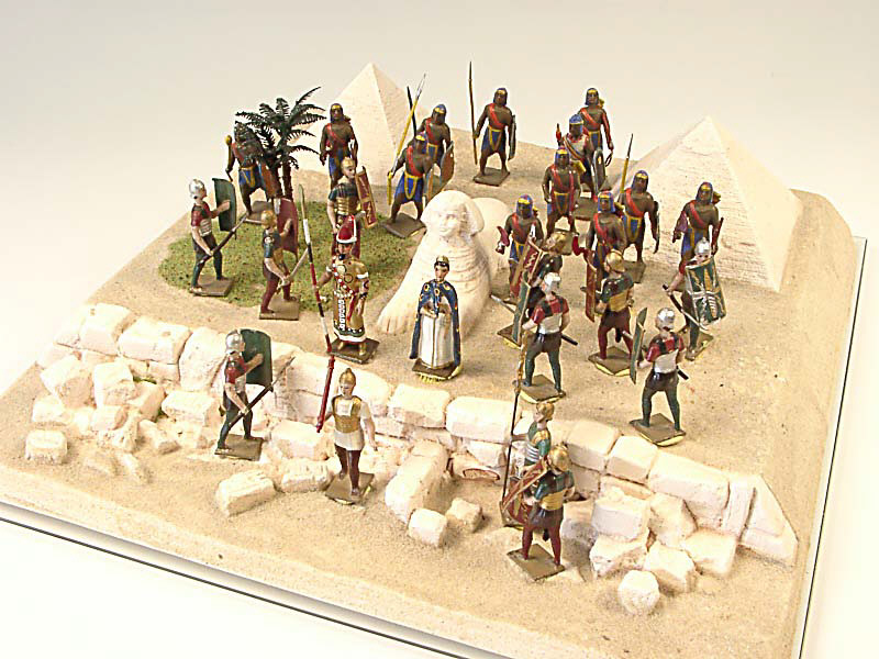comprend : 12 soldats égyptiens, 12 soldats romans, Cléopâtre, le roi Pharaon & des éléments de décor - avec vitrine de protection éclairée