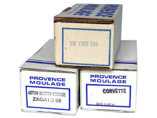 miniatures reproduisant les modèles : VOLKSWAGEN 1303 cabriolet, ASTON MARTIN VINTAGE ZAGATO 1986 & CHEVROLET CORVETTE break - boîtes légèrement tachées