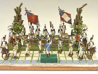 comprend : 11 musiciens, 4 fantassins, 4 cavaliers, 2 porte-drapeaux, un porte-enseigne & des éléments de décor - avec vitrine de protection