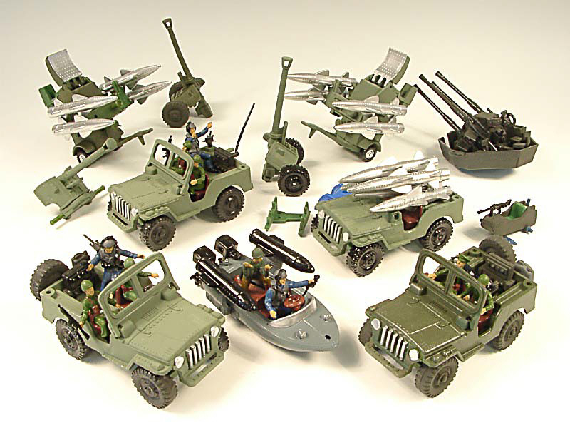 comprend : 4 jeep, 4 canons, 2 remorques lance-missiles, un bateau avec rockets & 9 soldats - manque des accessoires