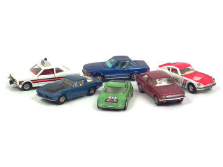 comprend : MORRIS MARINA (petits détails de peinture ajoutés), MERCEDES 350 SL (petits détails de peinture ajoutés), ISO GRIFFO, DATSUN 240 Z, FORD GT 70 & CORTINA GXL 'POLICE'