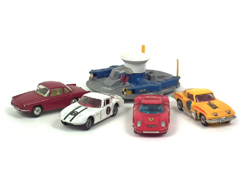 comprend : MARCOS VOLVO, FERRARI 250 Le Mans (petits détails de peinture & décalques ajoutés), CHEVROLET CORVETTE STINGRAY (pellicule chromée incomplète par endroits), RENAULT FLORIDE & HDL HOVERGRAFT