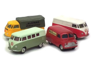 comprend : VOLKSWAGEN COMBI (3 exemplaires différents dont un avec décalques ajoutés & un autre avec légères traces d'humidité sur la carrosserie) & BEDFORD 'KLG' (état 'B', rare version avec moteur à friction fonctionne)