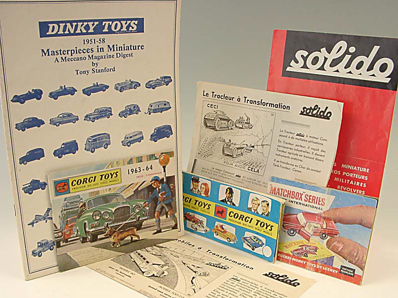 comprend : 2 catalogues CORGI TOYS (1963-1964 & 1966), un catalogue MATCHBOX de 1963, un catalogue SOLIDO & un livret sur les DINKY TOYS, réalisé un 1971, reprenant des extraits du MECCANO magazine de 1951 à 1958 - on y joint 2 notices sur les SOLIDO démontables