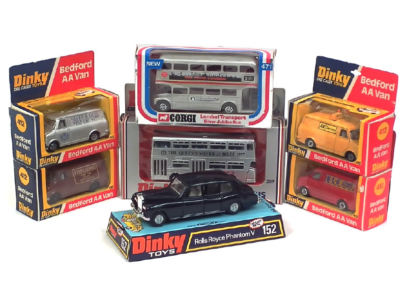 comprend : ROLLS ROYCE PHANTOM V, SILVER JUBILLE BUS, LONDON DOUBLE DECKER, BEDFORD VAN 'AA SERVICE', 'FIND LATERS, 'KLG' & SILVER JUBILE 1952/1977 (boîte en état 'c', blister déchiré)