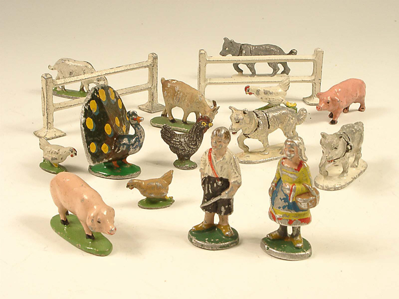comprend : un gardien & une gardienne de basse-cour, 2 cochons, 3 poules, un coq, 2 chèvres, un paon & 3 chiens d'attelage