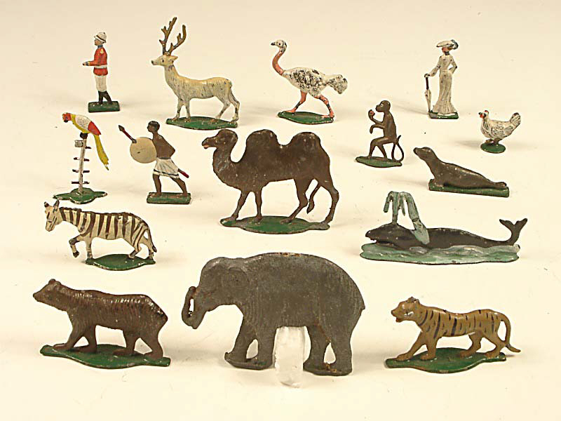 comprend : un ours, un phoque, une autruche, un bouquetin, un singe, une balleine, un éléphant (manque support), un tigre, un zèbre, une poule, un perroquet, un chameau un Africain, un soldat colonial & une femme