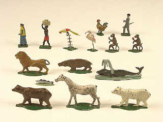 comprend : 2 ours, 2 singes, une balleine, un perroquet, un cheval, un poisson, un lion, un flamant rose, un coq, un hippopotame, un Africain, un Chinois & un homme avec canne & cigare